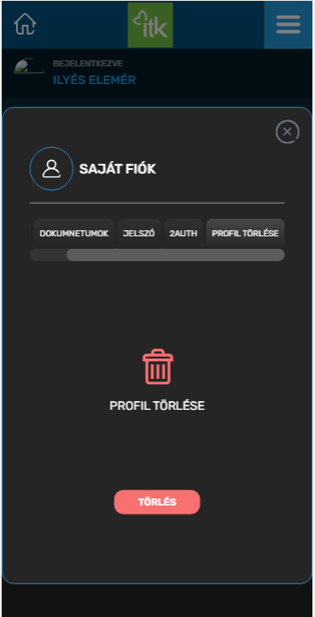 A saját fiók beállításaira kattintva előugró ablakban lehet a profil törlését kezdeményezni. desktop: 2. 3. ábra, mobil: 7. ábra.